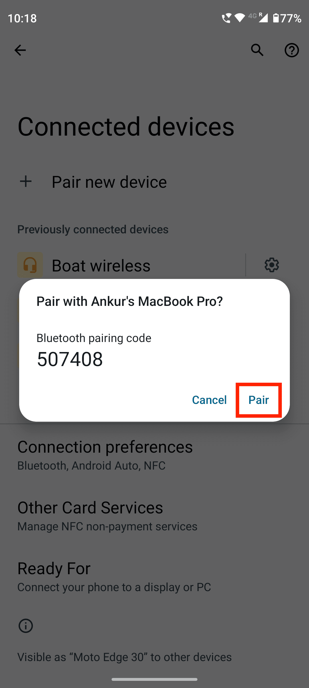 4) Agora você verá um pop-up em seu telefone Android dizendo: “Emparelhar com Mac?” Ele também terá um código de emparelhamento Bluetooth. Certifique-se de que o mesmo código seja exibido no Mac e toque em Emparelhar.