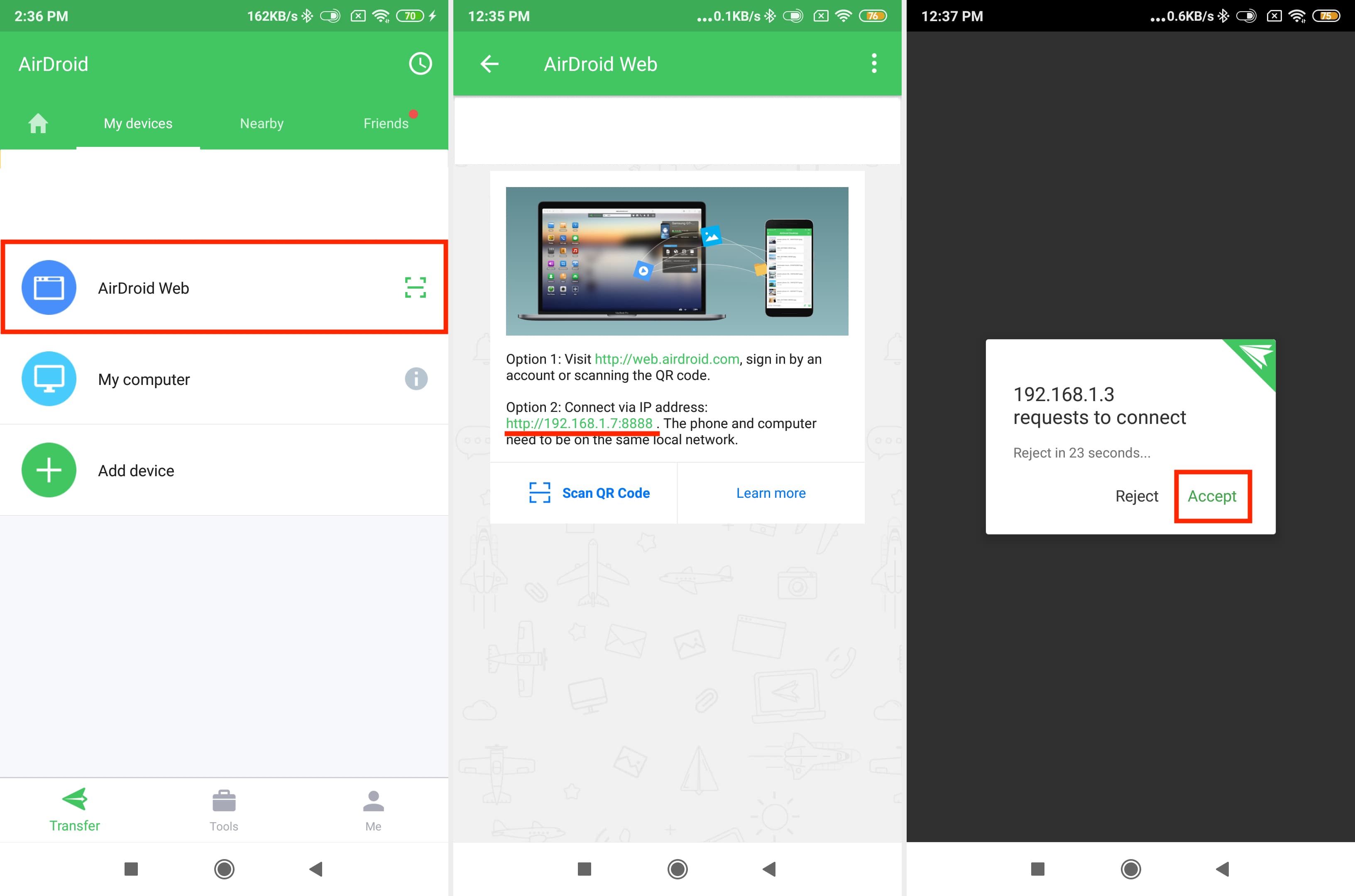 4) Toque em Aceite em seu telefone Android e isso estabelecerá uma conexão local entre o aplicativo AirDroid em seu telefone Android e o AirDroid Web em seu Mac.