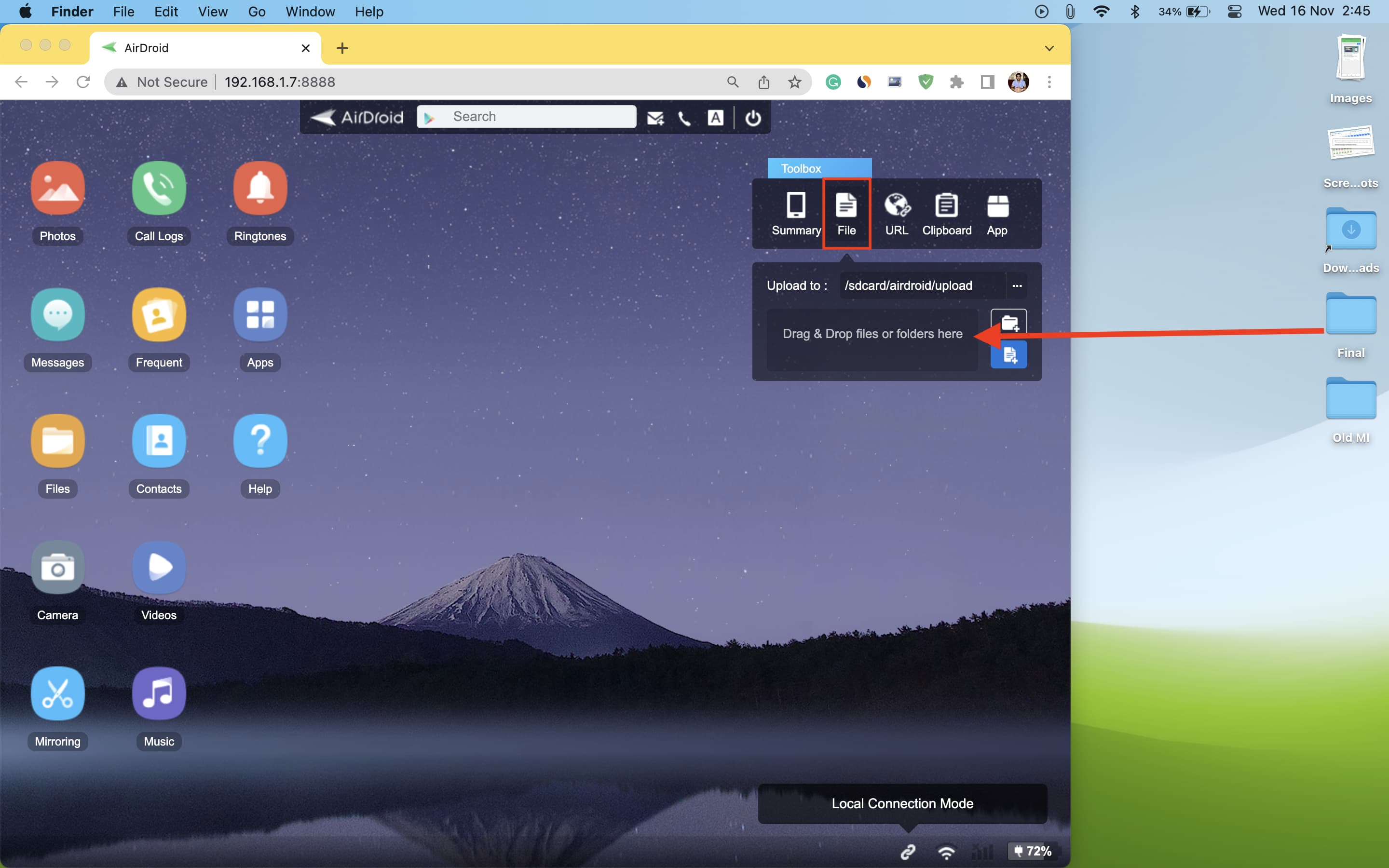 Clique em Arquivo na tela da web do AirDroid. Arraste e solte os arquivos ou pastas do seu Mac nesta pequena janela. Ele irá transferi-los sem fio para o seu telefone Android.