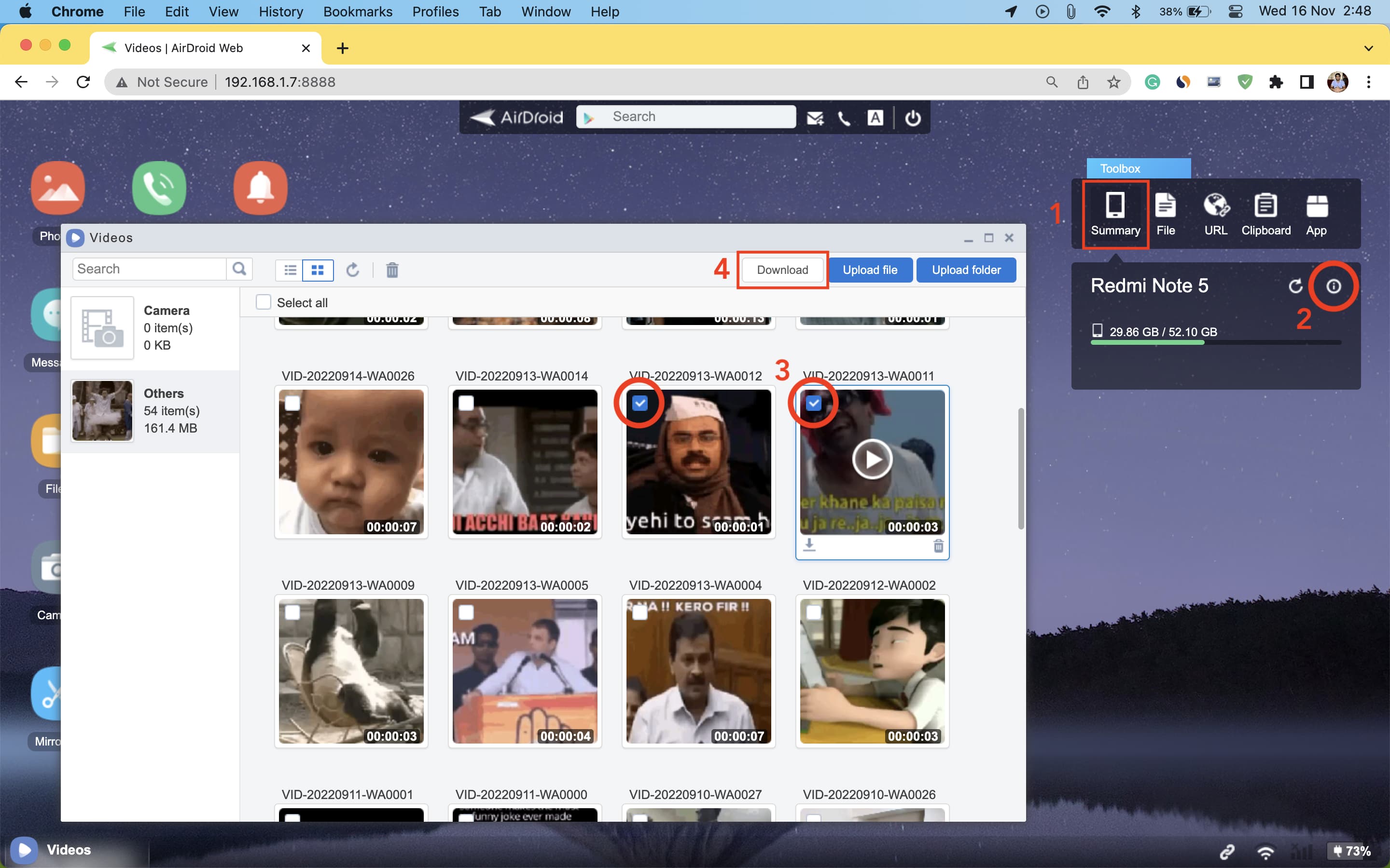 Na tela do AirDroid Web, clique em Resumo e ele mostrará seu telefone Android. A partir daqui, clique no minúsculo botão de informações ⓘ. Selecione Fotos ou Vídeos e ele será aberto em uma pequena caixa. Selecione o arquivo e clique em Download. Você também pode fazer upload de arquivos, ou seja, enviar arquivos para o seu telefone Android a partir desta mesma tela.