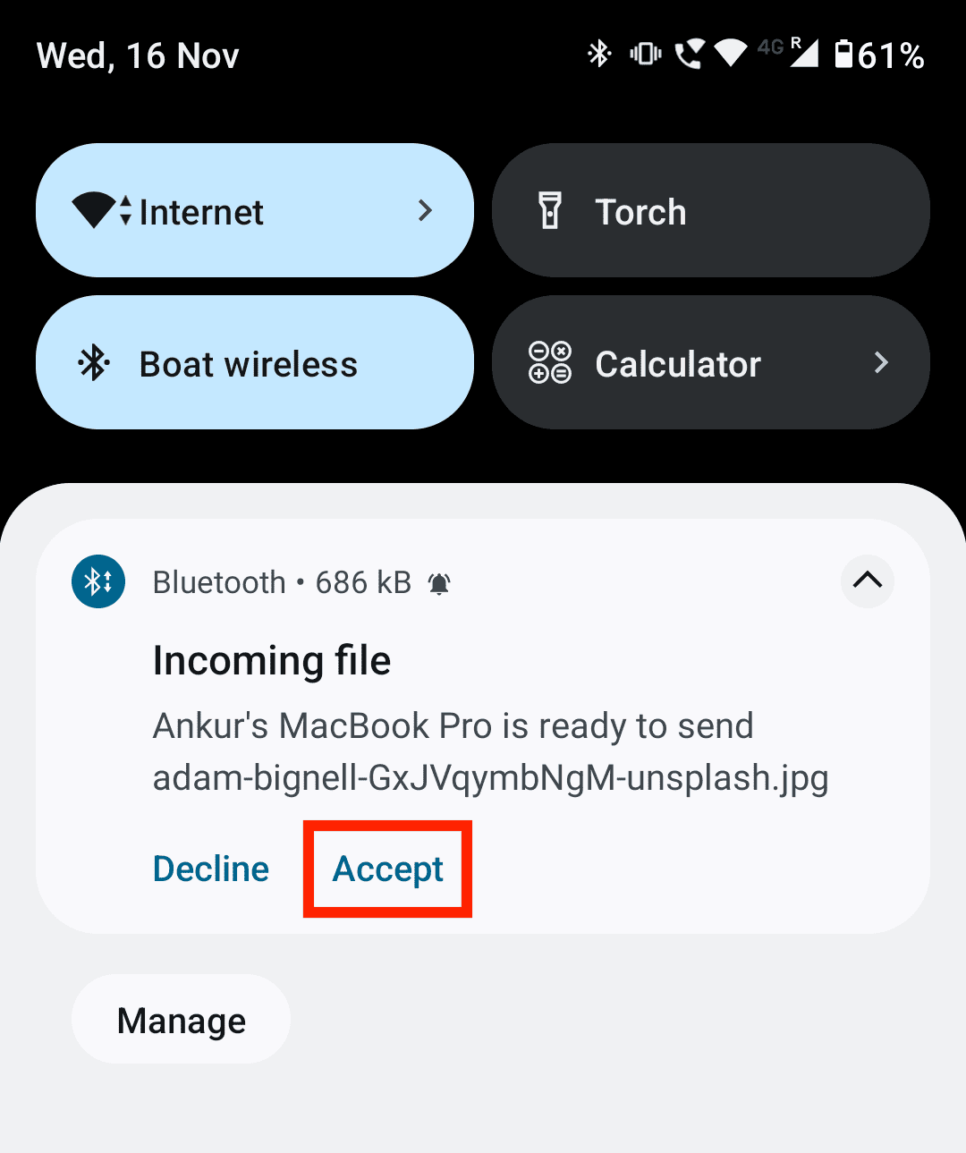 Finalmente, você verá uma notificação no seu telefone Android pedindo sua permissão para receber o arquivo. Toque em Aceitar e a transferência de arquivos por Bluetooth começará.