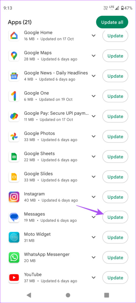 Ainda com o mesmo problema? É hora de verificar se há uma atualização do aplicativo Mensagens para o seu telefone Android. Isso removerá todos os bugs ou falhas na versão atual do aplicativo que fazem com que as Reações de mensagem não estejam funcionando.