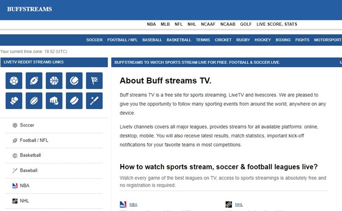 A interface do usuário do site parece desatualizada, mas é limpa e fácil de usar usar. Além das transmissões ao vivo de esportes online, o BuffStreams também é usado para receber os últimos resultados, estatísticas de partidas, notificações importantes sobre o início do jogo e muito mais.