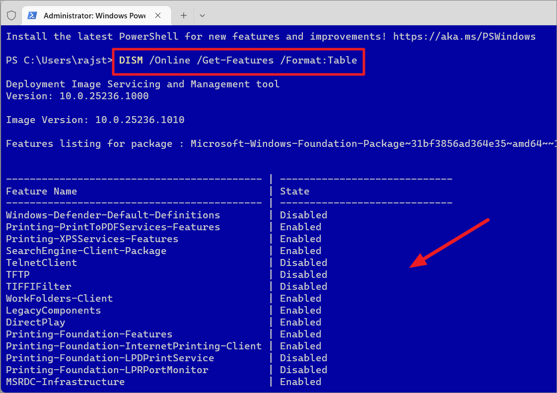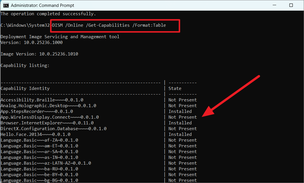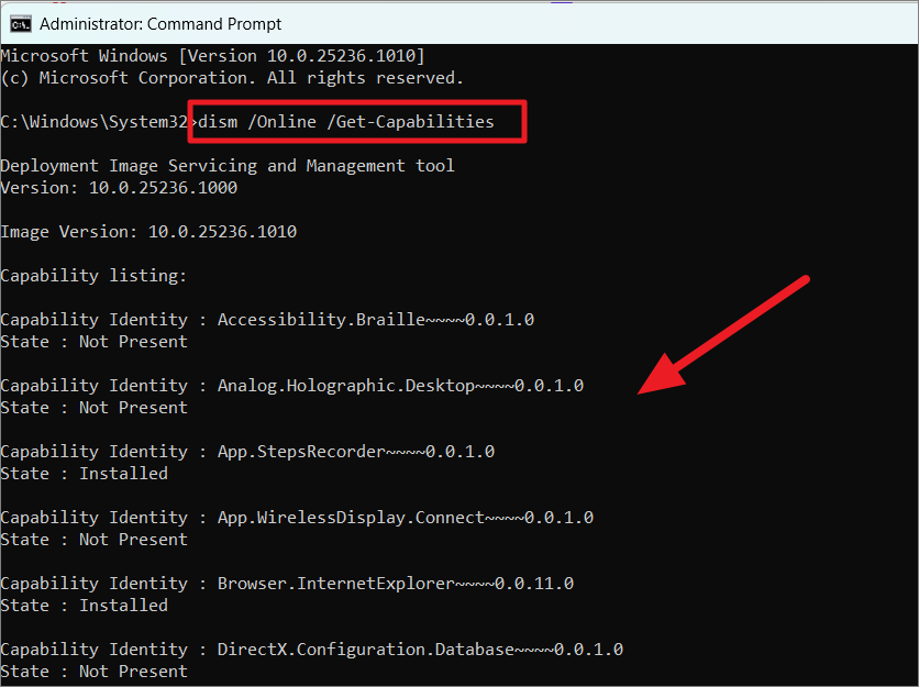 O comando acima listará todos os recursos ou componentes opcionais disponíveis no Windows 11 ( incluindo recursos opcionais das configurações e painel de controle) e seu status de instalação. If the Status of a feature is’Not Present’, it means that the feature is not installed.