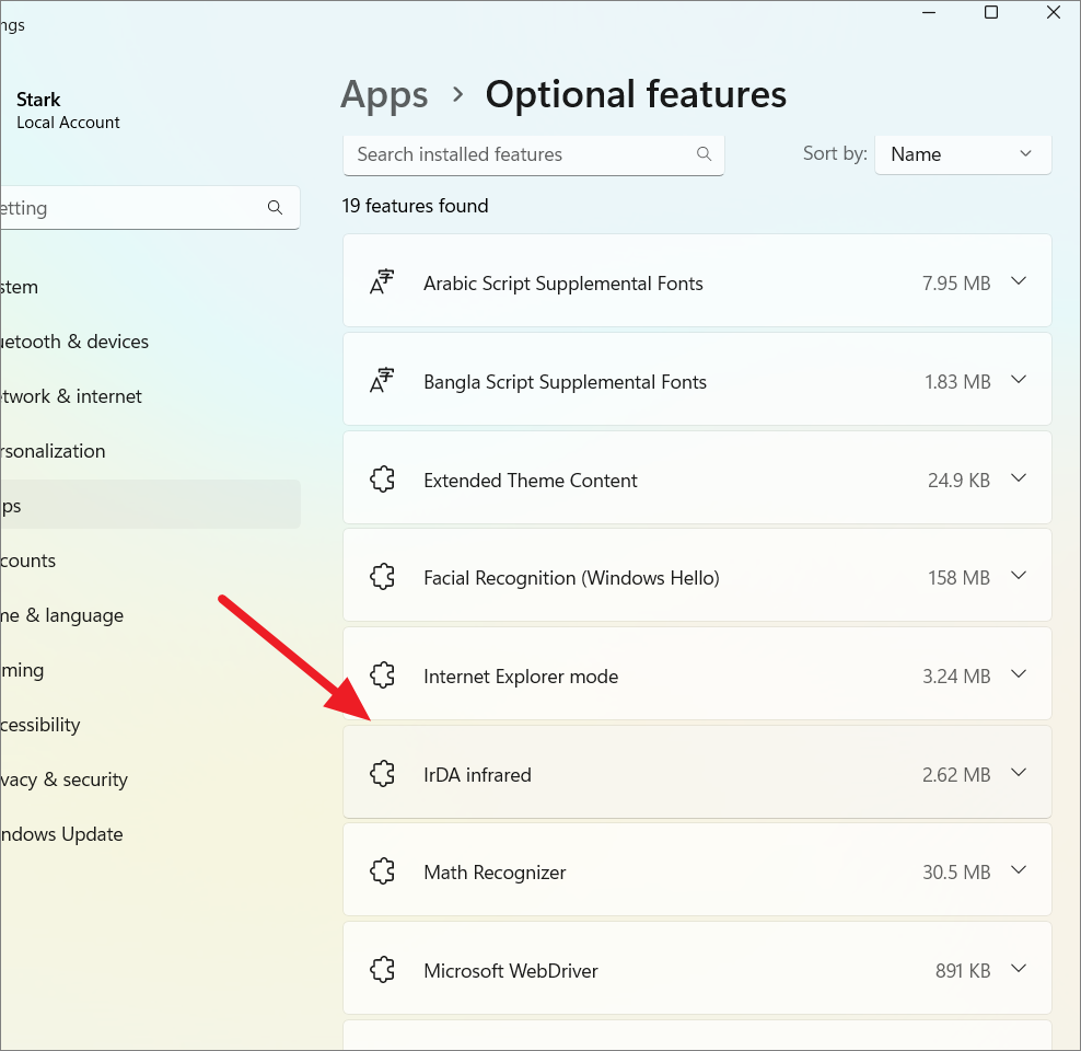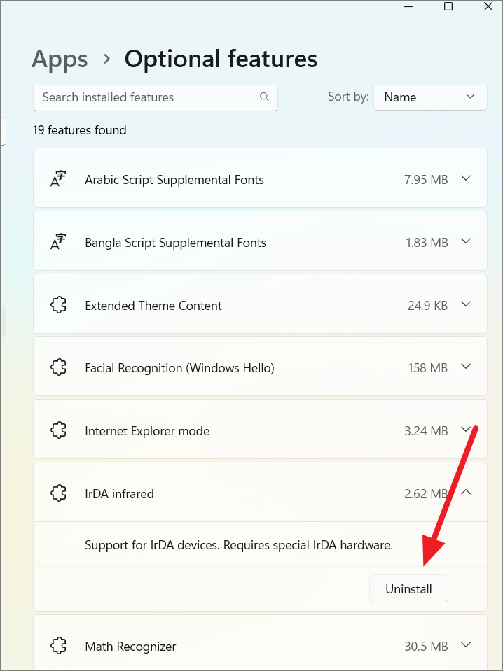 On the Optional Features settings page, locate the feature you no longer need and click it.
