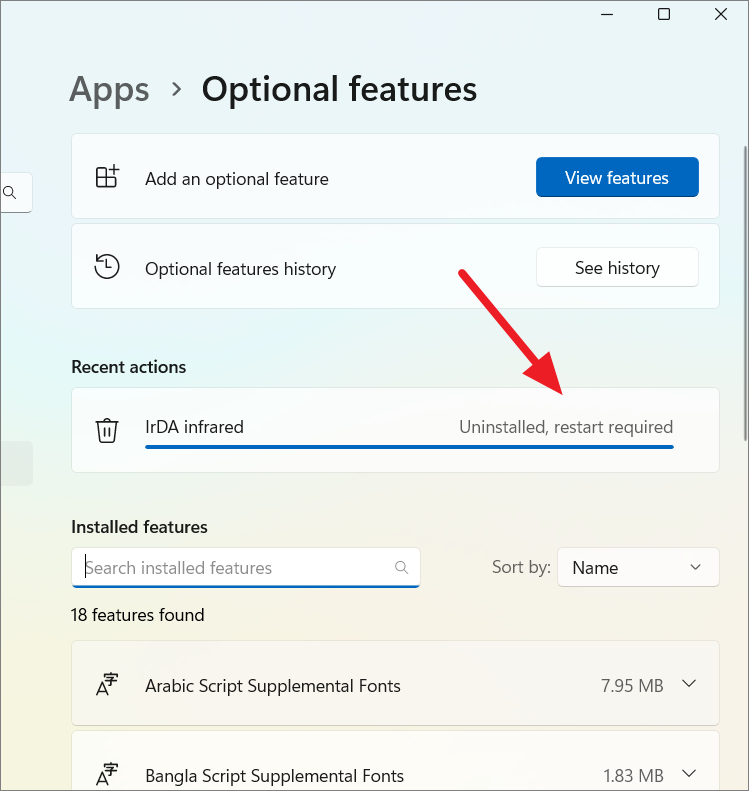 Após a desinstalação do recurso, se o recurso removido recentemente feature under the’Recent actions’says’restart required’, you need to reboot your PC to complete the process.