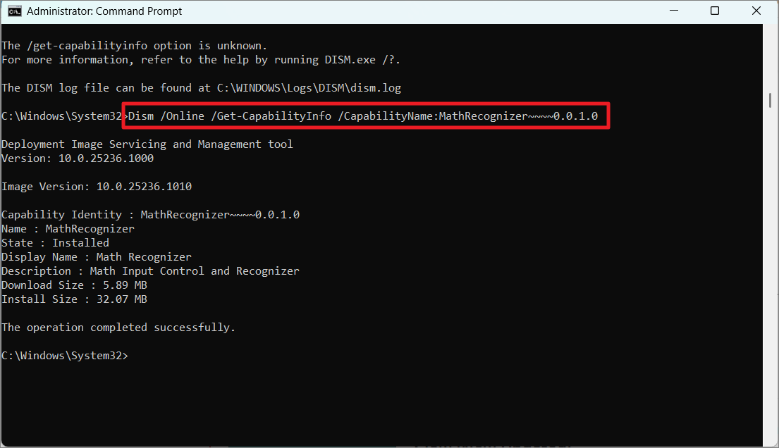 Dism/Online/Get-Capab ilityInfo/CapabilityName:MathRecognizer~~~~0.0.1.0