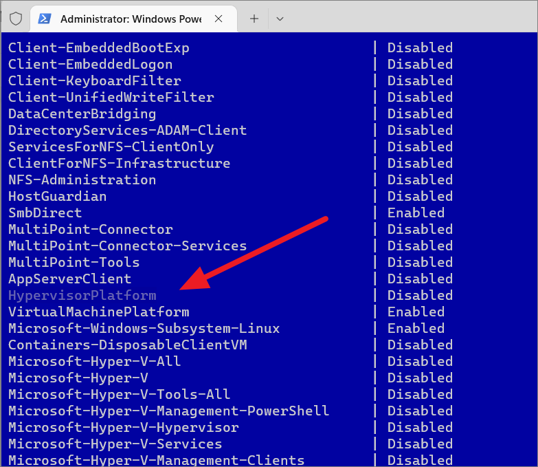 Enable-WindowsOptionalFeature –FeatureName HypervisorPlatform-All-Online