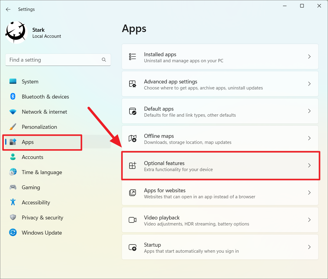 Abra as configurações do Windows pressionando Win+I e vá para’Aplicativos’guia no painel esquerdo. Then, select the’Optional features’option on the right.