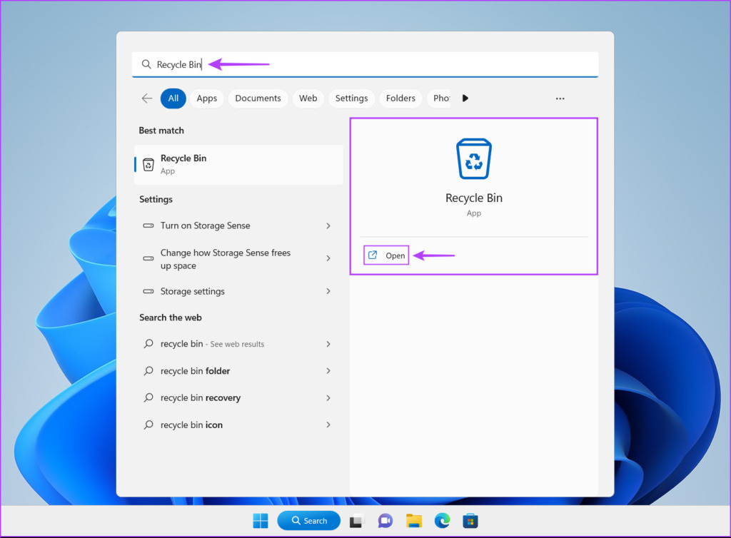 Etapa 1: Pressione as teclas Windows + S para abrir a Pesquisa do Windows e digite Lixeira. Em seguida, no resultado da Lixeira, clique em Abrir.