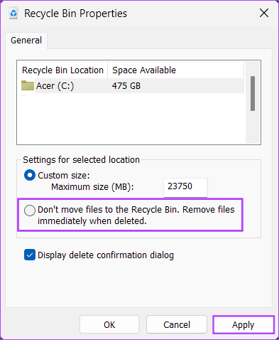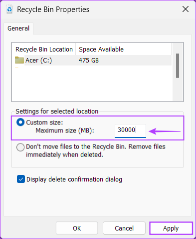 Etapa 3: Na reciclagem Na janela Propriedades da lixeira, verifique se o botão de opção ao lado de’Não mover arquivos para a Lixeira’. Remover arquivos imediatamente quando excluídos’é selecionado. Se for, escolha o botão de opção ao lado da opção Tamanho personalizado e insira um bom valor de quatro ou cinco dígitos, dependendo do seu armazenamento. Em seguida, clique em Aplicar para salvar as alterações.