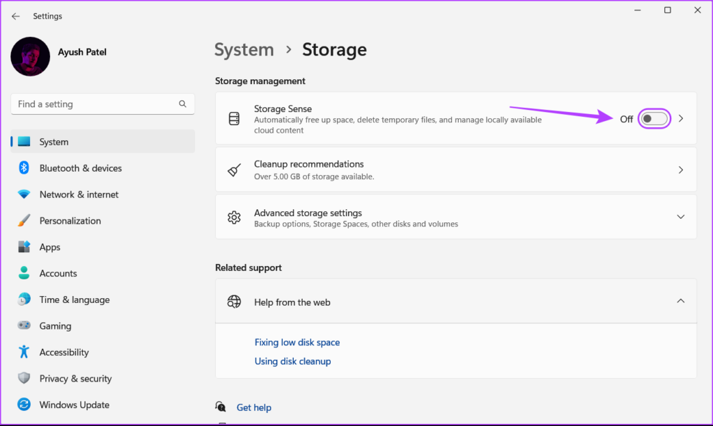 Etapa 3: Desative a opção ao lado de Storage Sense.