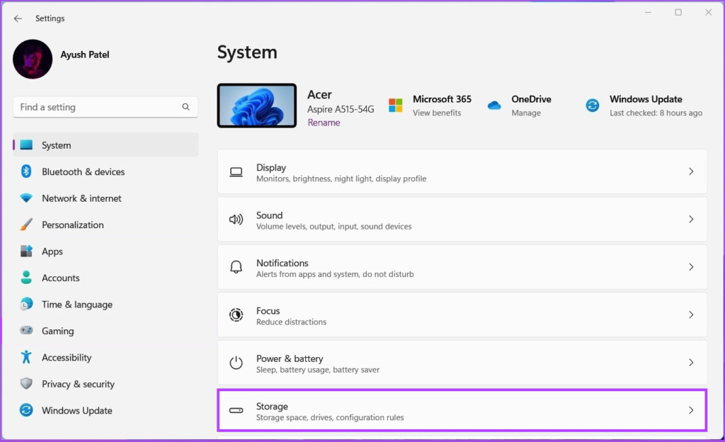 Etapa 2: quando o aplicativo Configurações abrir , selecione Sistema na barra lateral esquerda e clique em Armazenamento no painel direito.