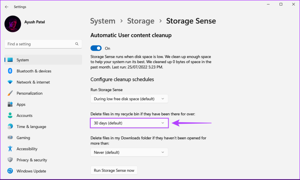 Outra possível explicação de por que você não consegue encontrar seus arquivos excluídos na Lixeira é que o Storage Sense pode tê-los excluído permanentemente. Embora o Storage Sense no Windows possa ajudar a liberar algum espaço em disco quando seu computador está com pouco armazenamento, ativá-lo automaticamente esvazia a Lixeira.