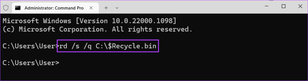 Etapa 3: Digite o seguinte comando na janela Prompt de Comando e pressione Enter para redefinir a Lixeira. Em seguida, repita o mesmo comando para cada unidade em seu computador, substituindo a letra C pela letra da outra unidade.