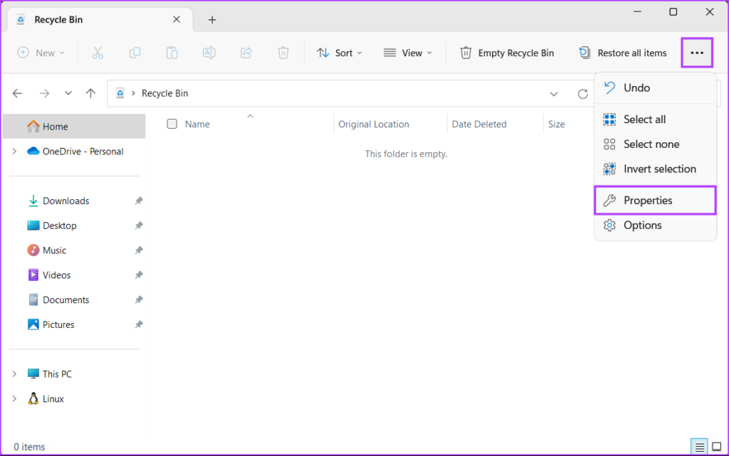 Etapa 2: Quando a Lixeira abrir, clique no menu de três pontos horizontais na barra de ferramentas no canto superior direito e selecione Propriedades.