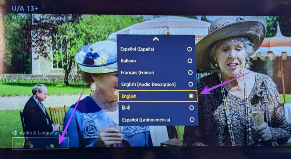 Para desativar a audiodescrição em um aplicativo de streaming específico, reproduza um vídeo do aplicativo que continue descrevendo as cenas. Acesse Áudio e idioma. Selecione qualquer idioma diferente daquele com uma descrição de áudio entre colchetes.