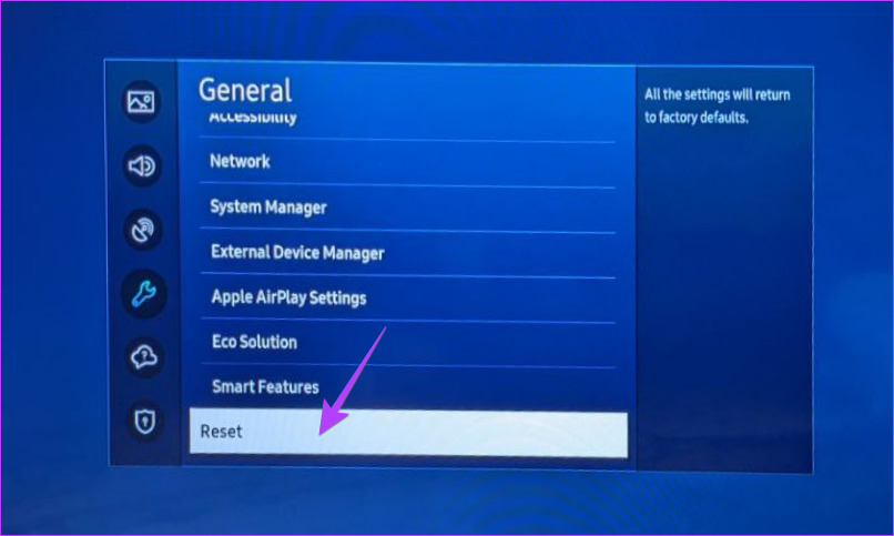 Se nada fizer a voz desaparecer na TV Samsung, você deve tentar reiniciar sua TV. Isso restaurará todas as configurações para seus valores padrão. Assim, desative a voz na sua TV Samsung.