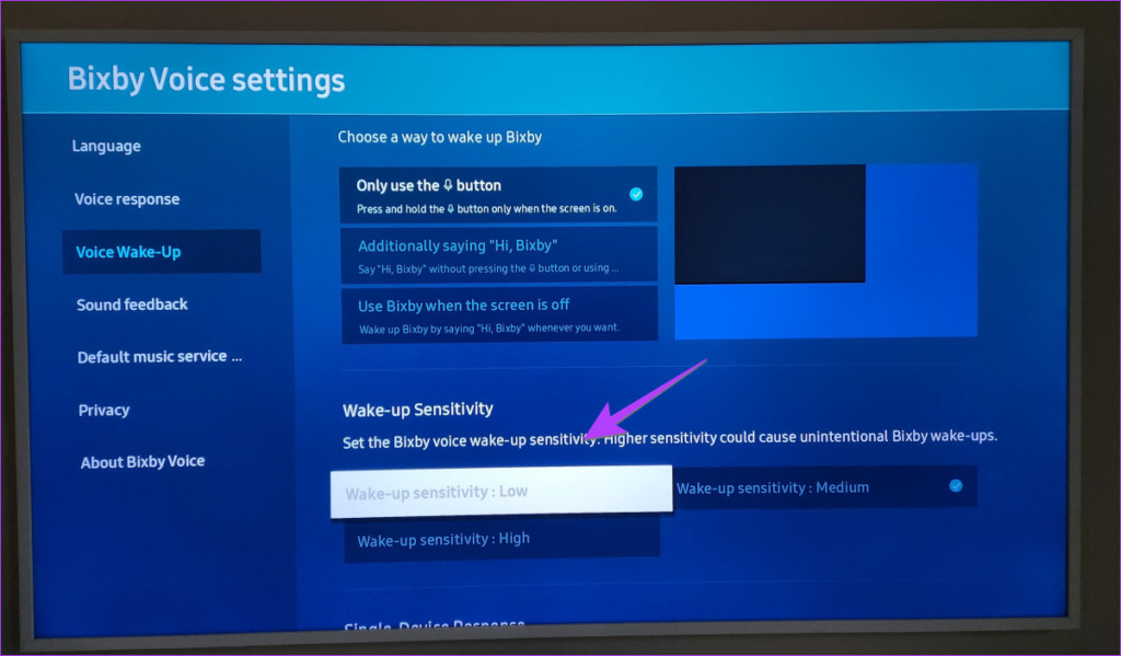Etapa 5: Como alternativa, se quiser mantê-lo ativado, selecione Sensibilidade de ativação: baixa em vez de Médio. Dessa forma, o Bixby não será ativado em sons médios ou desnecessários.