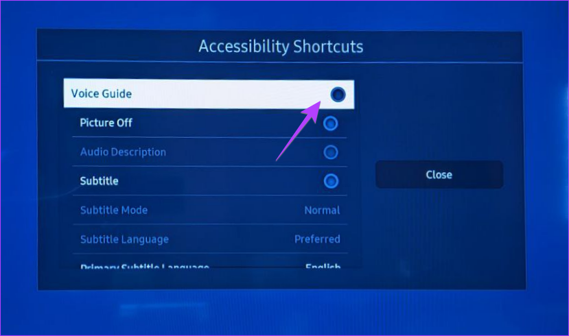 Etapa 2: A janela de atalhos de acessibilidade aparecerá na sua TV. Se você perceber que o círculo de seleção ao lado do Guia de Voz está azul ou realçado, isso significa que o recurso está ativado. Selecione a opção Guia de Voz para desativá-lo.