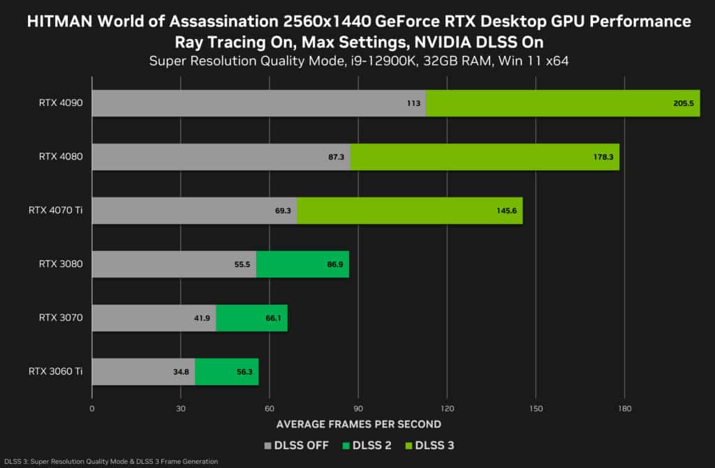 O aclamado HITMAN 3 da IO Interactive introduziu suporte para DLSS 2, reflexos opacos traçados por raios e sombras traçadas por raios, no ano passado. Agora, juntamente com a atualização do HITMAN World of Assassination, o DLSS 3 foi adicionado. Quando o DLSS 3 estiver ativado, o desempenho de 4K com uma GeForce RTX 4090 aumentará em 2,4X para 162 FPS e com uma GeForce RTX 4080 aumentará em 2,7X para 127 FPS. Com uma GeForce RTX 4070 Ti a 1440p, o DLSS 3 aumenta o desempenho em 2,1X e oferece 145 FPS.
