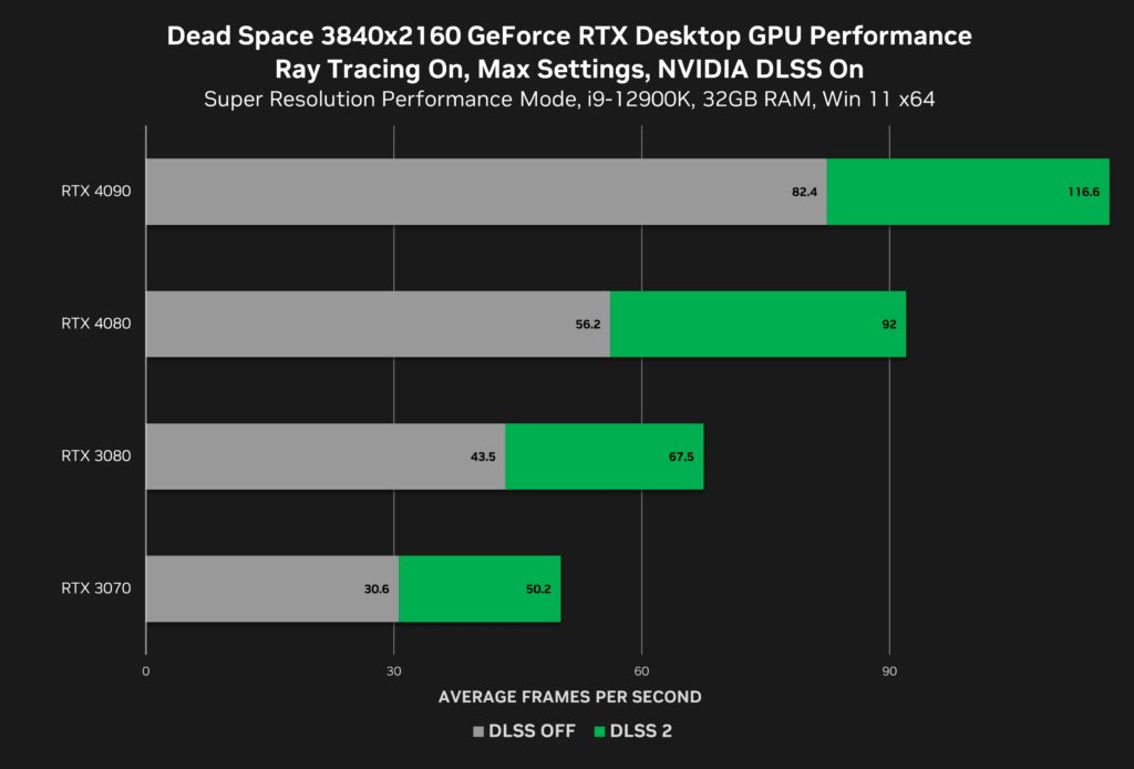 E enquanto Dead Space só foi lançado hoje com DLSS 2, uma versão mais antiga da tecnologia, a NVIDIA diz que o recurso ainda pode fornecer aumentos de desempenho de até 63% no remake da EA e Motive de Visceral Games’clássico do terror de ficção científica.