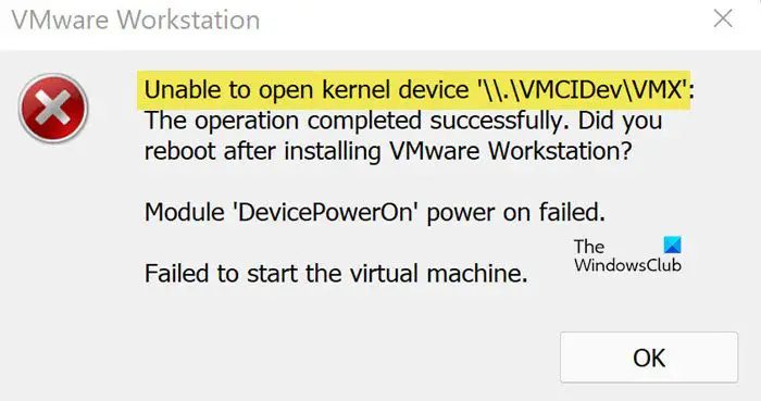Não é possível abrir o dispositivo do kernel’\\. \VMCIDev\VMX’: A operação foi concluída com sucesso. Você reiniciou após instalar o VMware Workstation?