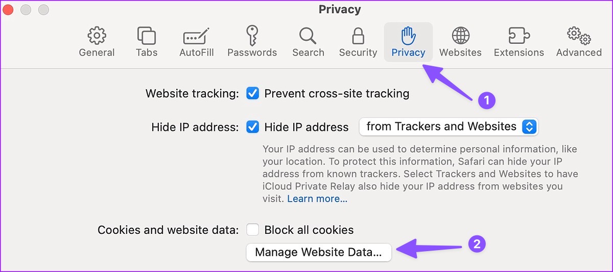 Etapa 2: Quando a janela Configurações do Safari abrir, vá para a guia Privacidade. Clique em’Gerenciar dados do site’.