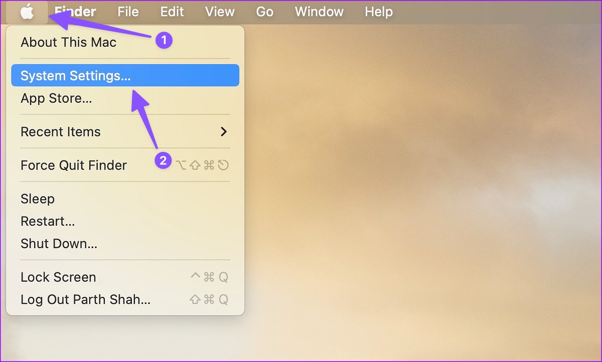 Etapa 1: Clique no ícone da Apple no canto superior esquerdo da Barra de menus e abra Configurações do sistema no menu contextual.