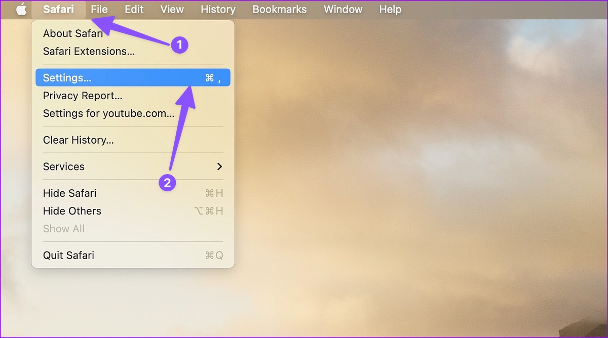 Etapa 1: Com o Safari aberto em seu Mac, clique no Safari no canto superior esquerdo da barra de menu e selecione Configurações no menu contextual.