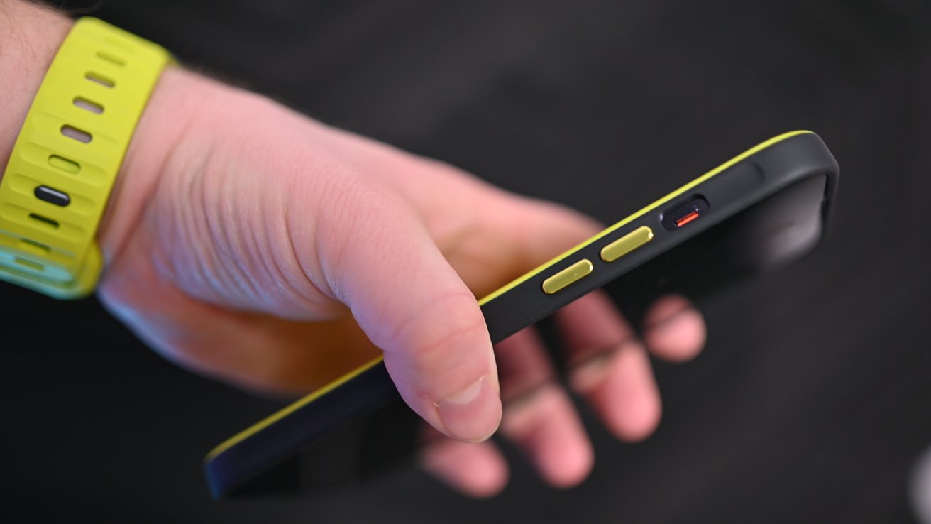 Todos os três botões-botão lateral e os dois botões de volume-são anodizados em amarelo claro para complementar a parte traseira High Volta.