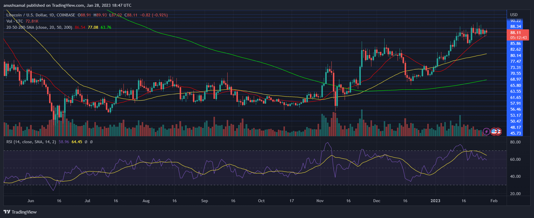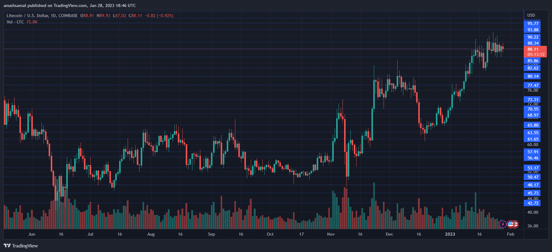 O preço do Litecoin foi de $ 88,11 no dia gráfico | Fonte: LTCUSD no TradingView