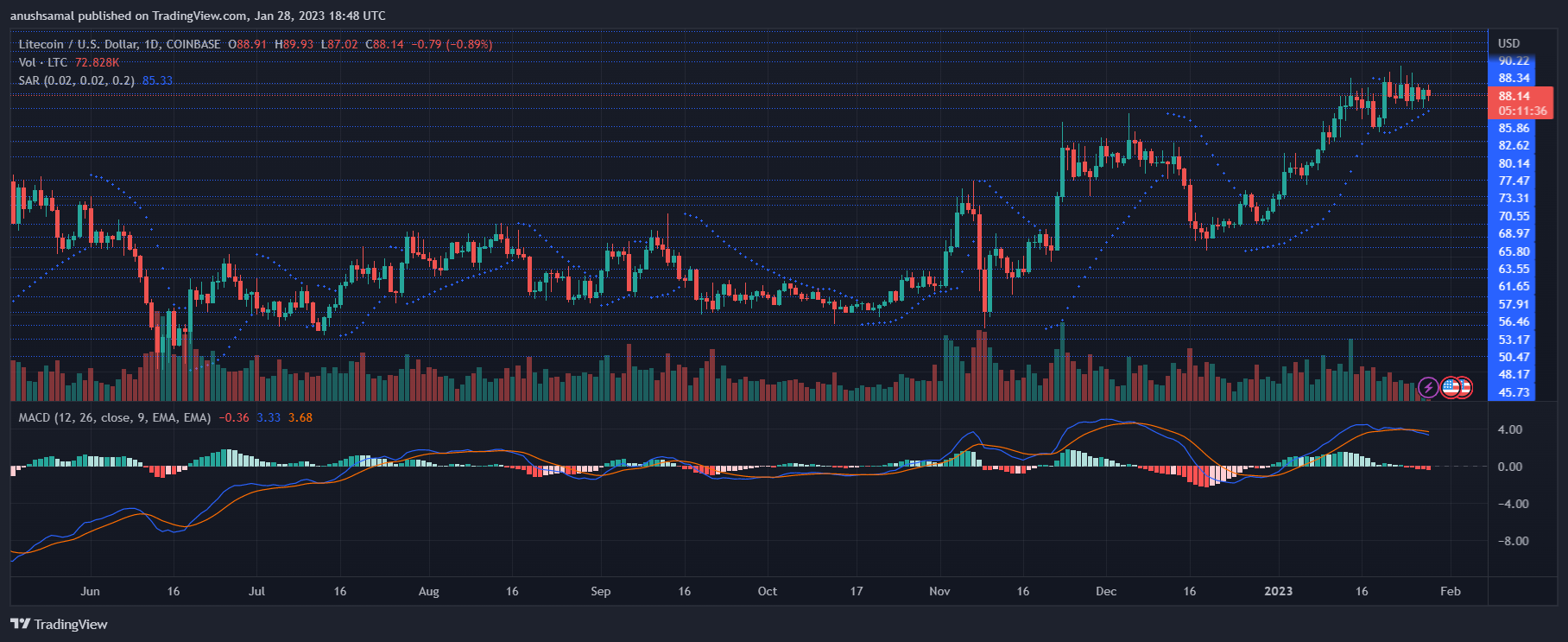 O preço do Litecoin mostrou uma recuperação considerável desde que atingiu seu ponto mais baixo em dezembro de 2022. O LTC garantiu quase 50% de valorização em janeiro deste ano. Atualmente, no entanto, a altcoin testemunhou uma queda de preço e está se consolidando em seu gráfico diário.