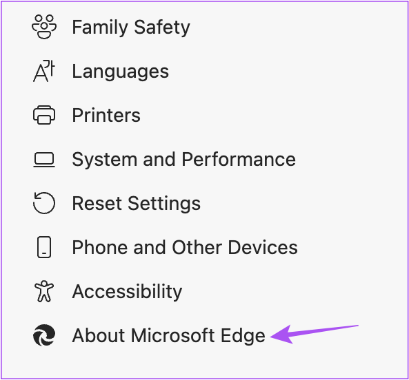 Etapa 3: Clique em Sobre o Microsoft Edge à esquerda menu.