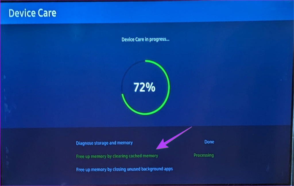 Sua TV começará a diagnosticar os problemas e também liberará memória limpando o cache de todos os aplicativos. Você verá a opção Liberar memória limpando a memória em cache quando o cuidado do dispositivo estiver em execução.