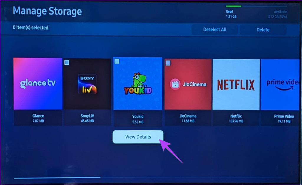 Etapa 4: você verá a lista de aplicativos instalados em sua TV Samsung. Acesse o aplicativo cujo cache você deseja limpar e pressione o botão para baixo no controle remoto para selecionar Exibir detalhes.