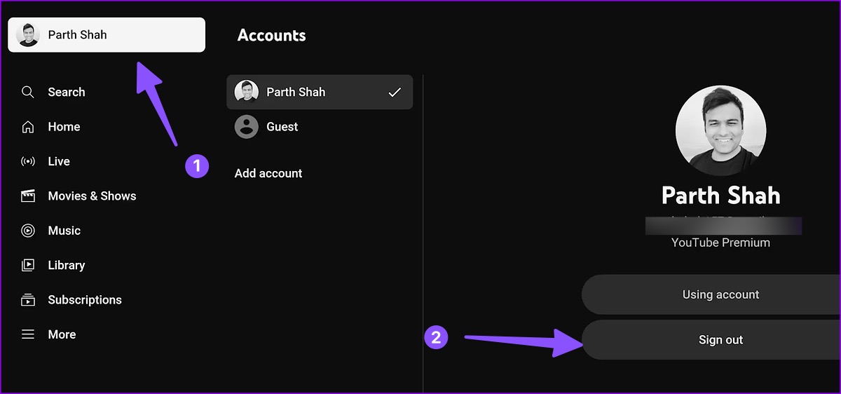 Etapa 1: Inicie o YouTube app na sua Apple TV e selecione sua conta na barra lateral.
