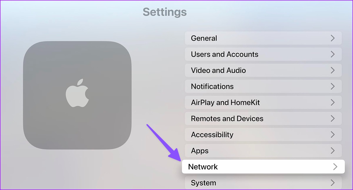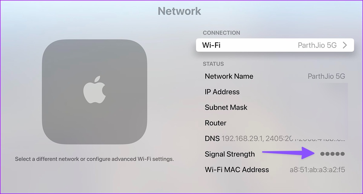 Você deve primeiro verificar a conectividade com a Internet em sua Apple TV. Para uma experiência de streaming do YouTube sem falhas, recomendamos configurar uma conexão Ethernet na sua Apple TV (se for compatível, é claro). Se você tiver um modelo somente Wi-Fi, conecte-se a uma banda de frequência de 5 GHz em seu roteador de banda dupla. Depois disso, siga as etapas abaixo para confirmar a força da rede.