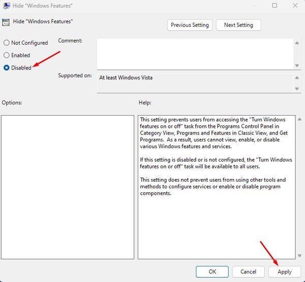Se a política”Ocultar recursos do Windows”estiver ativa, você não encontrará os recursos opcionais. Mesmo se você conseguir encontrá-lo, enfrentará problemas ao instalá-los. Portanto, você precisa verificar e desativar a política’Ocultar recursos do Windows’para corrigir os recursos opcionais que não instalam o Windows 11.