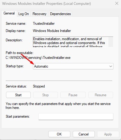 O instalador de módulos do Windows ou TrustedInstaller é um serviço que permite a instalação, modificação e remoção de atualizações do Windows e componentes opcionais. Ele também lida com os recursos opcionais que você deseja adicionar. Portanto, você precisa garantir que o serviço esteja em execução no seu dispositivo.
