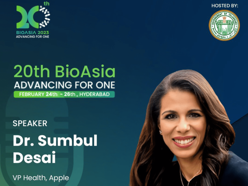 Dra. Sumbul Desai, vice-presidente de saúde da Apple, deve visitar a Índia no próximo mês para compartilhar suas ideias sobre como a tecnologia de saúde está transformando o setor de saúde globalmente. Ela atuou anteriormente no Departamento de Medicina da Universidade de Stanford, nos Estados Unidos, ao lado da Dra. Sangita Reddy, Diretora Administrativa Adjunta dos Hospitais Apollo. O Dr. Desai fará uma palestra no evento BioAsia 2023, que acontecerá no dia 25 de fevereiro em Hyderabad. BioAsia é um evento internacional anual com foco nos setores de biotecnologia, farmacêutica, tecnologia médica, saúde e ciências da vida. O evento está sendo organizado pelo governo de Telangana e acontecerá de 24 a 26 de fevereiro.