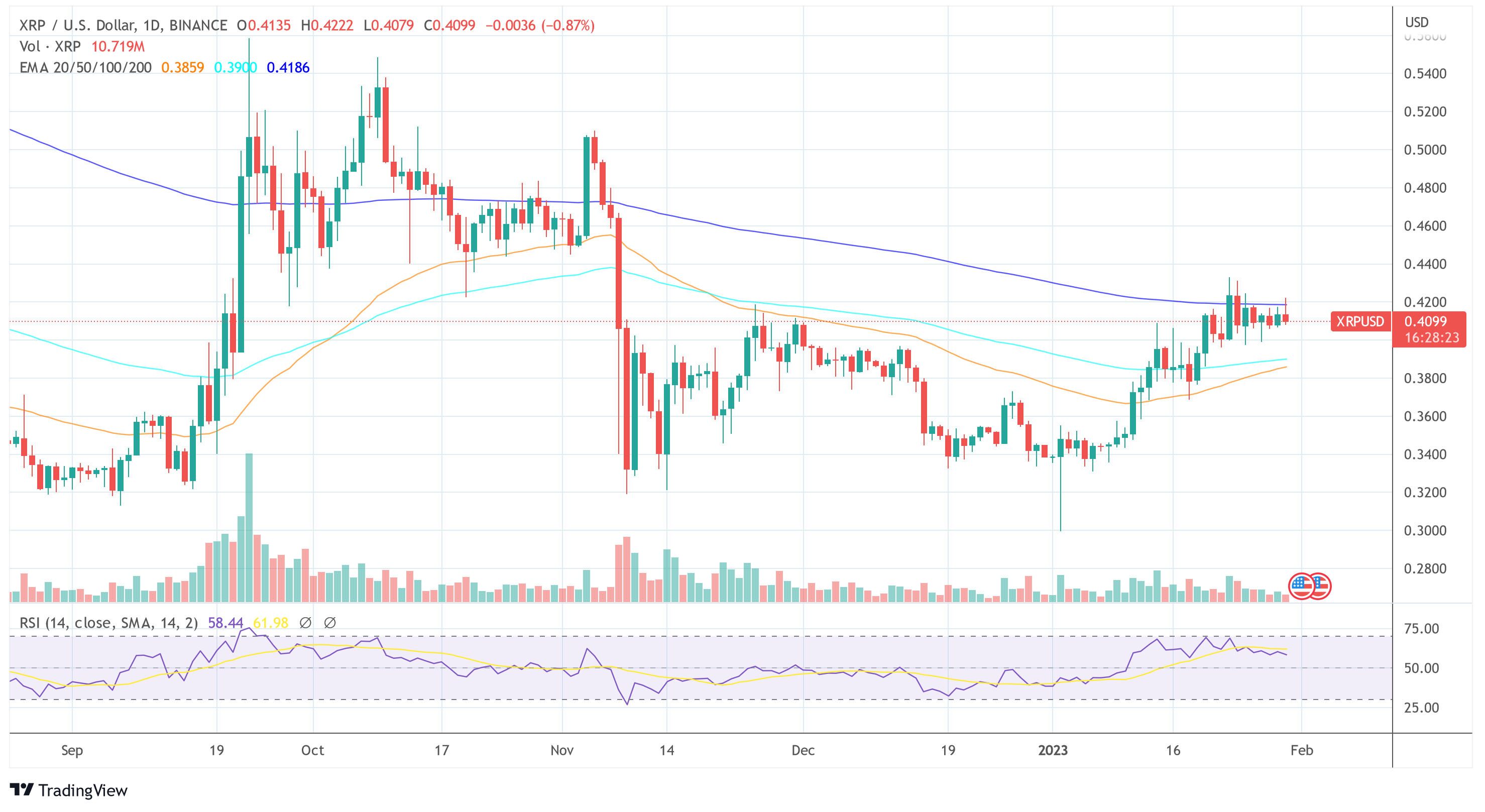 No momento, o preço do XPR estava em US$ 0,4099, lutando para escalar acima dos 200-EMA do dia.