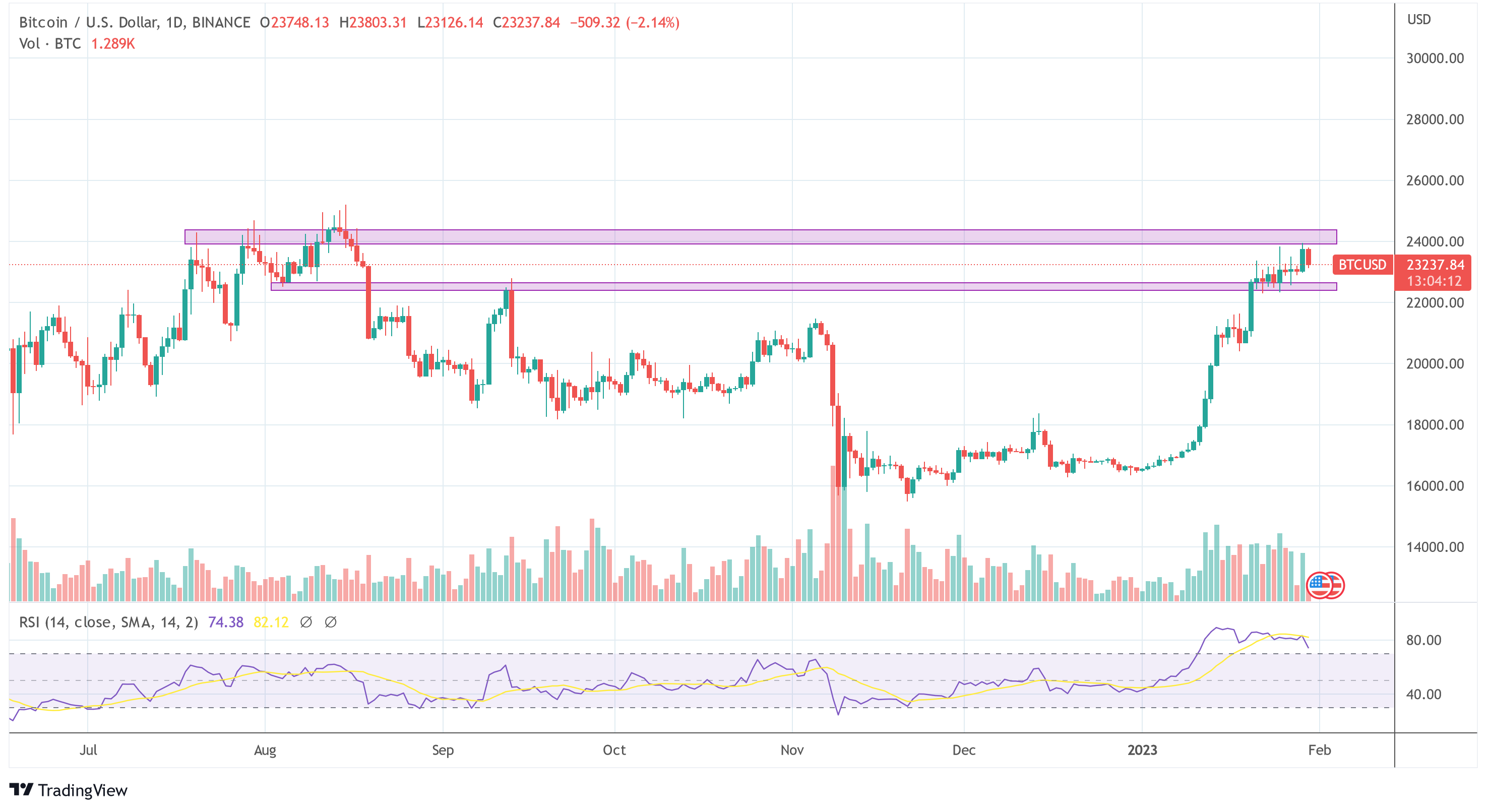 Os investidores devem, portanto, se preparar para uma semana volátil. Para o Bitcoin, a zona de resistência acima de US$ 24.000 é atualmente crucial, enquanto o suporte de cerca de US$ 22.700 no lado negativo deve ser observado.