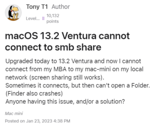 Além disso, alguns usuários (1,2,3,4,5,6) também estão enfrentando um problema em que o compartilhamento de arquivos SMB não está funcionando para eles após a atualização do macOS 13.2 Ventura.