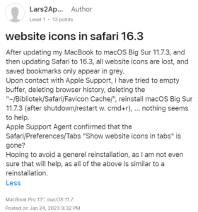 No entanto, alguns usuários do macOS Big Sur (1,2,3,4) em 11.7.3 estão alegando que seus ícones favoritos estão faltando ou ficaram cinza após o lançamento do Safari 16.3.