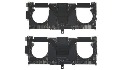 Parte superior: placa lógica M1 Pro com dissipador de calor maior. Inferior: placa lógica M2 Pro com dissipador de calor menor (via iFixit ).