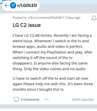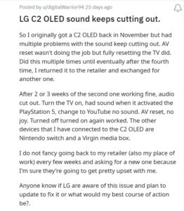 Outro LG C2 65 polegadas O proprietário da smart TV relatou ter esse problema quando conectado a uma barra de som Sonos Beam 2 externa via eARC e PS5. Eles também afirmam ter quedas de som a cada dois minutos.