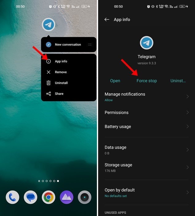Forçar parada não tem link direto com o aplicativo Telegram, mas muitos usuários afirmaram corrigir o problema de atualização do Telegram travado ao fazê-lo.