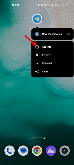Então, você pode tentar isso e não há mal algum em fazê-lo. A parada forçada do aplicativo Telegram liberará todos os processos relacionados ao Telegram do segundo plano. Para forçar a parada do aplicativo Telegram, pressione e segure o ícone do aplicativo na tela inicial e selecione Informações do aplicativo.