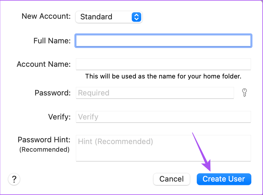 Etapa 5: Preencha todos os campos e clique em Criar usuário no canto inferior direito.